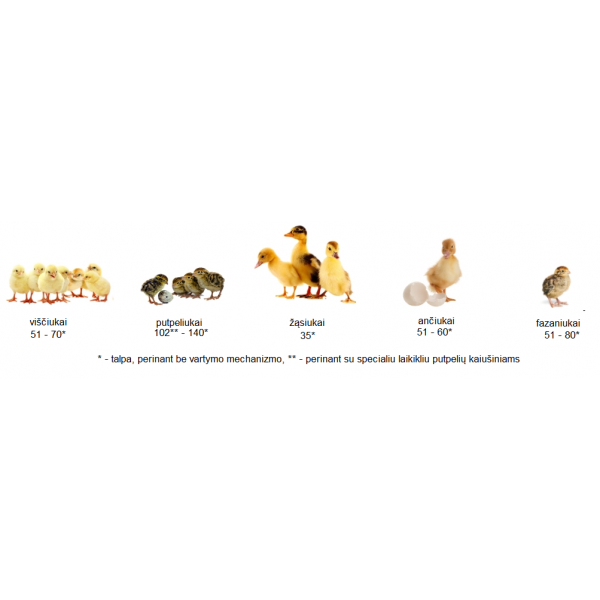 Inkubatoriaus talpa - 51 kiaušinis, nenaudojant vartymo mechanizmo, telpa iki 70 vištinių kiaušinių.